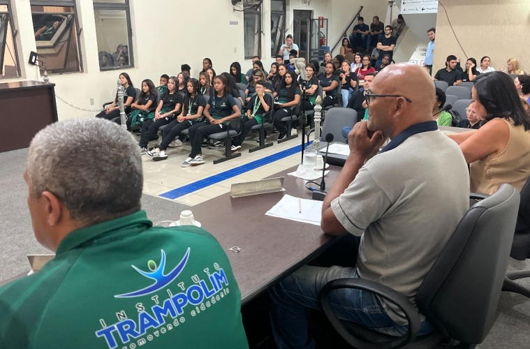HOMENAGEM A ATLETAS | Na reunião ordinária desta semana, realizada na terça (23), 22 pessoas, entre atletas e comissão técnica, receberam Homenagem Especial da Câmara Ouro Branco pelo terceiro lugar no quadro geral de medalhas na modalidade olímpica de Ginástica de Trampolim no Torneio Nacional disputado em Maceió. A iniciativa foi dos vereadores Nélison José Alves e Warley Higino Pereira, conforme Regimento Interno da Casa Legislativa.