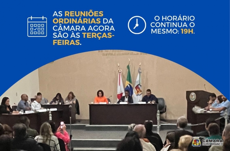 As reuniões ordinárias da Câmara Ouro Branco agora acontecerão às terças-feiras! E a alteração já vale a partir da próxima reunião, que será no dia 23 de setembro.